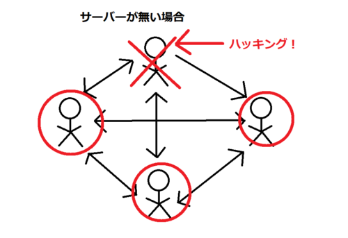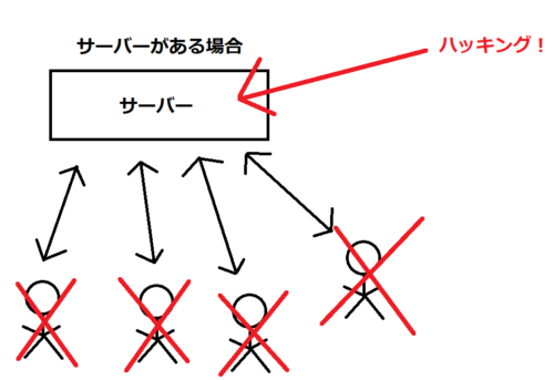 サーバーを介してやり取りを行なう場合、サーバーがハッキングされたら一環の終わりです。